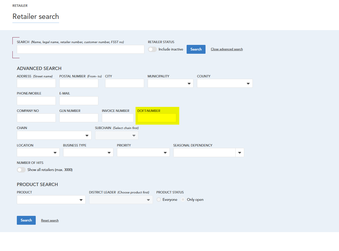 Notice: Some retail stores have the DOFT-number set as their Legal name instead of the number being set as the DOFT-product's pre-system number. In these cases, the user will not get a result when using this new field.